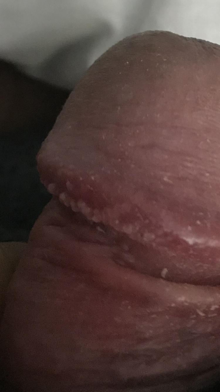mi duda de contagio es porque después de eso, me aparecieron como unas perlas blancas en mi glande con un poco de picazón y siento que tengo la lengua un poco más blanca de lo habitual ... aparte de eso no he tenido otros síntomas.