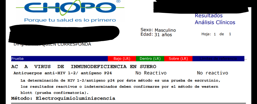 si pe puede orientar con este resultado o alguien que se alla ido hacer prueba en laboratorio chopo. lo que pasa que al preguntar ala persona del laboratorio no me supo decir con seguridad que tipo de prueba me estaba realizando esto fue hoy en la mañana y en la tarde al ver el resultado dice anticuerpos anti vih1/2 /antigeno p24, entonces esta prueba se podria considerar de 4 generacion es metodo electroquimioluniscencia. ya e ido a 2 laboratorios diferentes y me an dicho que la espera tiene que ser de 3 meses para el resultado fiable.