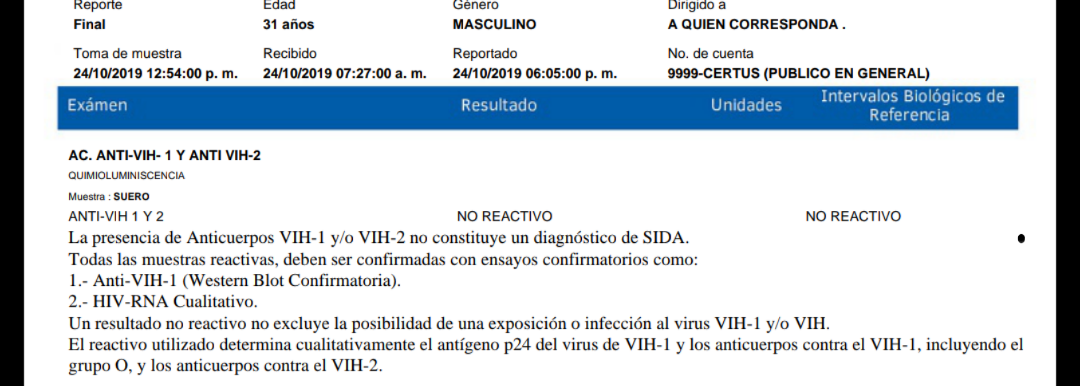 Me informaba cada vez más y me entere que no debía hacerme está prueba a muy poco tiempo todos los días pensaba y soñaba con este virus hasta que llegó el día 28 y pues estaba muy intranquilo tenía mucha ansiedad día y noche oraba por qué me salve de esta pues te digo me hice una prueba de 4 generación antígenos p24 y anticuerpos (quimiuluminicienca) y salió no reactivo y fue cuando sentí otro gran alivio pero pues por estar mucho tiempo pensando en esto me dió gastritis nerviosa . E incluso se me bajaron las defensas